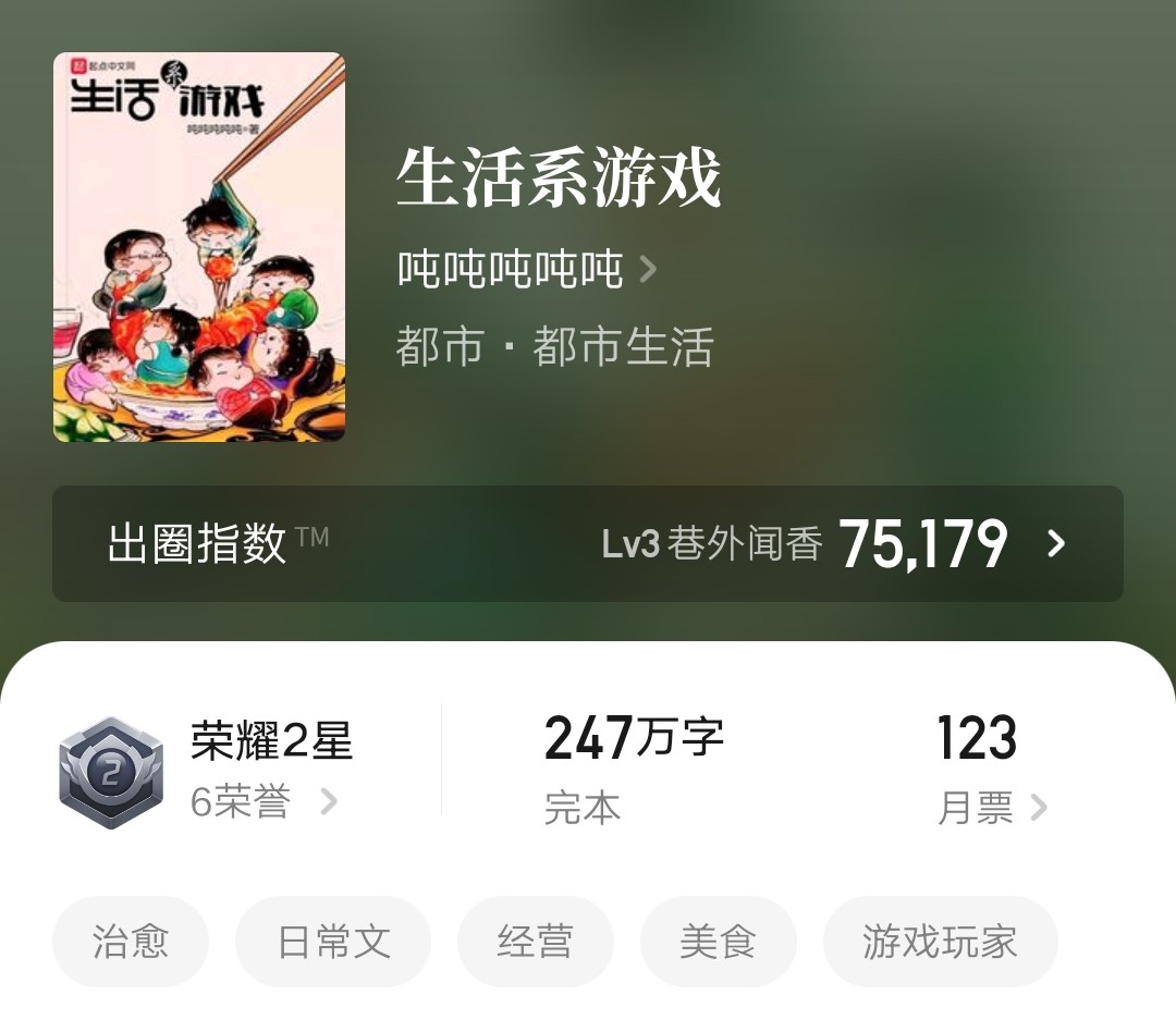 推荐理由:本书是一本美食文,一本以日常生活为主线,穿插各类美食背后的故事的美食文。和市面上很多以美食为题材的小说不同,这本小说更侧重人物的刻画、更侧重人物之间的交流互动。小说十分有特色的一点在于,它将每一道菜都赋予了一个或欢乐、或心酸的故事,让人看完后会对菜品保持深刻印象。本书的创作风格也非常欢乐、轻松、治愈,许多欢趣的梗毫无时代感,让人代入感非常强!