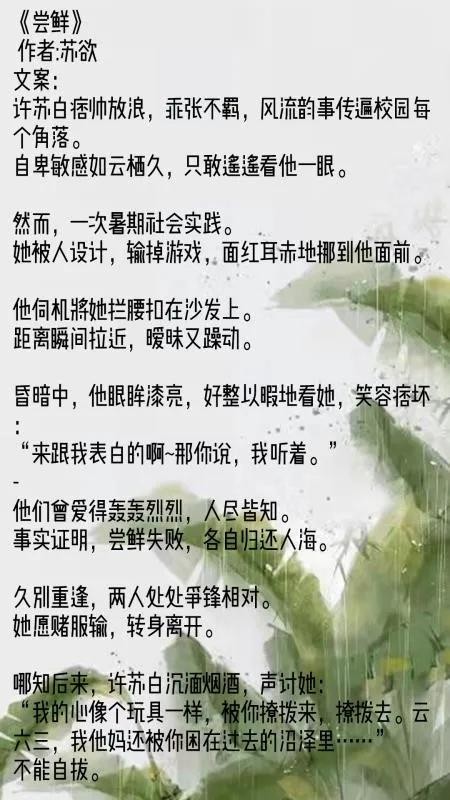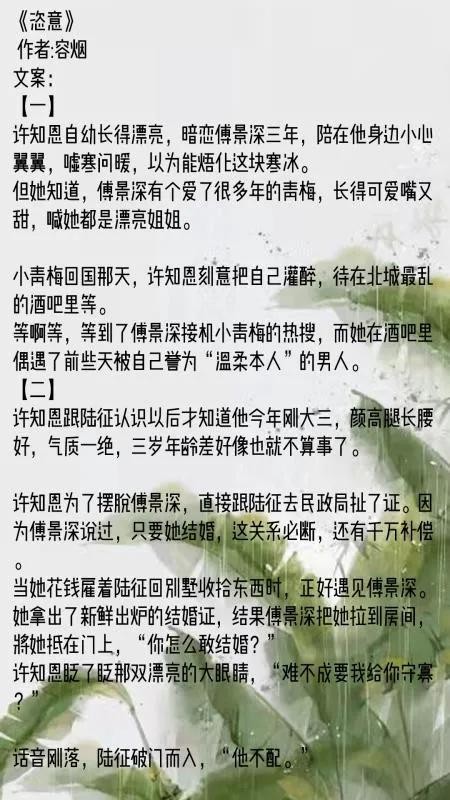 《恣意》这篇的立意还是很好的,而且女主放手的时候干脆利落,很值得看,强推一下!