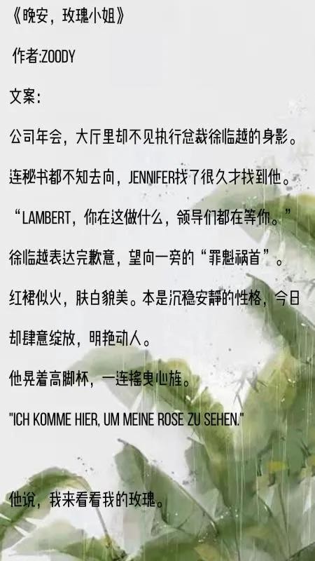 《晚安,玫瑰小姐》,虽然是短文,但是很不错噢!属于那种淡淡的甜,徐总真的太会了,就是感觉太短了,不够看。