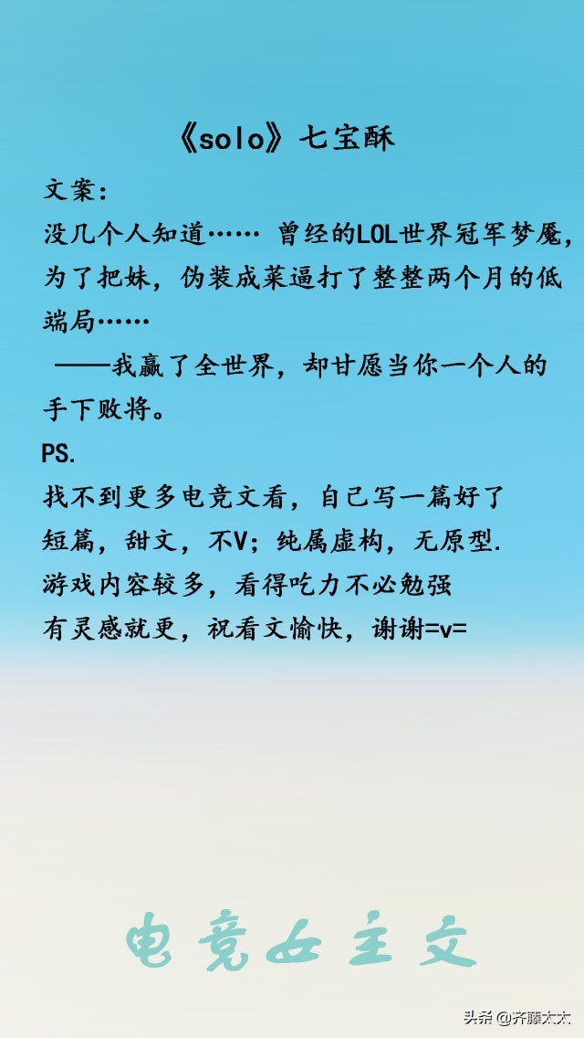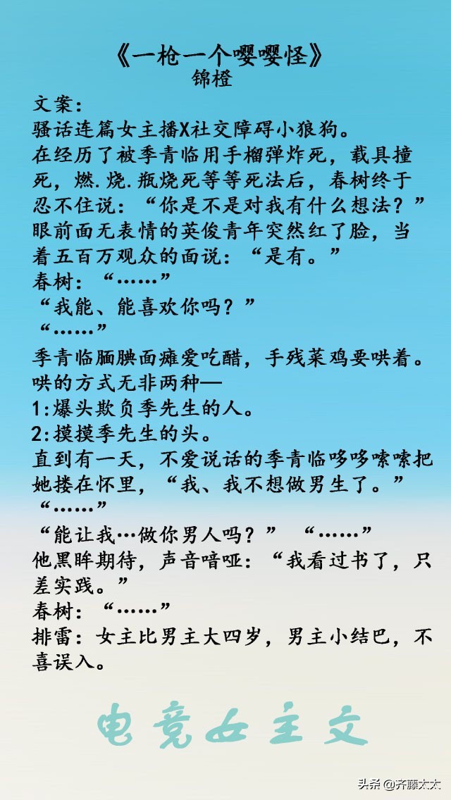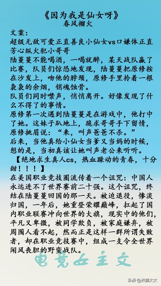 所以,这一期总结一下好看的电竞女主文,虽然我技术菜(基本不登录),但是不影响我看电竞小说呀,就算不会打游戏,基本上也能看懂!好喜欢会打游戏的小姐姐,一波女主玩游戏贼溜的甜文正在袭来~