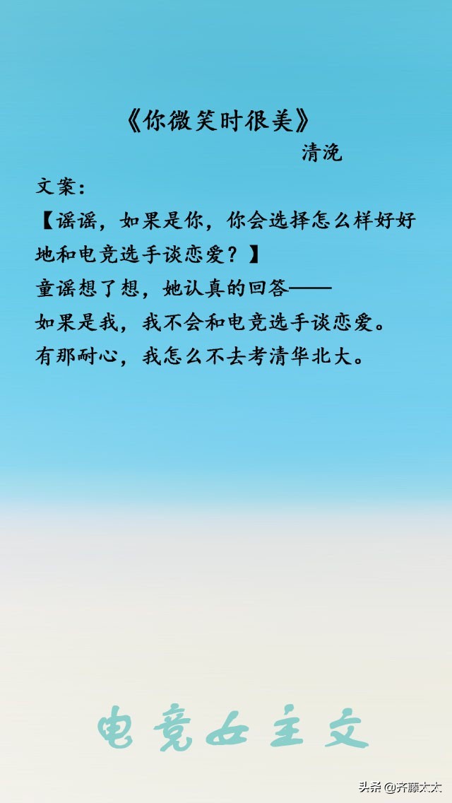 《你微笑时很美》看点是男女主互怼日常,真的有点小搞笑,女主看似老司机其实小白兔,男主看似清冷实则毒舌而温暖,欢喜冤家,日久生情,据说是非常经典的电竞文,电竞小迷妹们可以入坑!