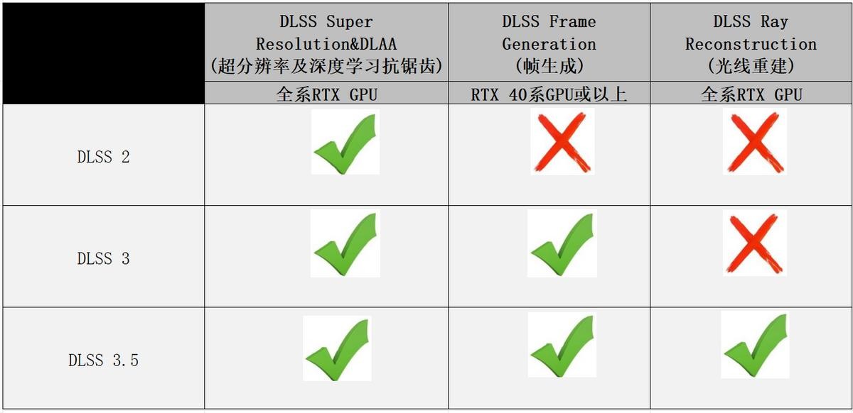//仅有RTX 40系GPU支持DLSS帧生成,DLSS 3.5则包含了目前NVIDIA DLSS技术的全部特性——超分辨率、深度学习抗锯齿、帧生成以及光线重建。