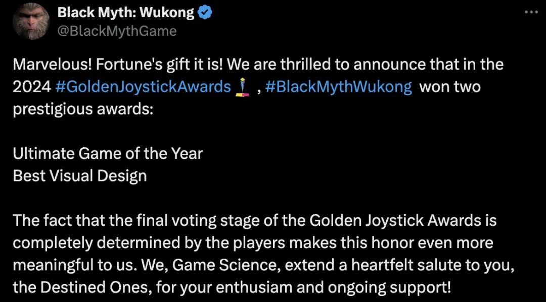 《黑神话:悟空》官号也第一时间发表了获奖感言: