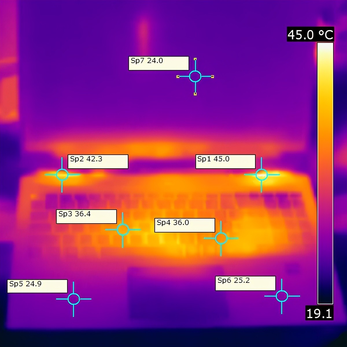在22.1℃环境下,我们通过AIDA64和Furmark软件对机械师F117-X进行处理器和独显双烤测试。烤机30分钟以后通过FLIR红外热成像仪观察到这台机器正面最高温度为45℃,位于C面转轴右侧的出风口附近,键盘中央区域的温度保持在36℃左右,摸上去感觉不到明显的热感。值得一提的是,双烤期间我们也特别注意到处理器和独显的功耗输出情况,其中处理器封装功耗维持在44.68W,频率一直维持在3.2GHz,处理器核心温度为90℃;独显功耗维持在113.4W,温度保持在79℃。可以看到,即便在处于双烤这样的极限环境,机械师F117-X的处理器和独显依然保持着较好的功耗输出,意味着这台机器的性能稳定、强悍。