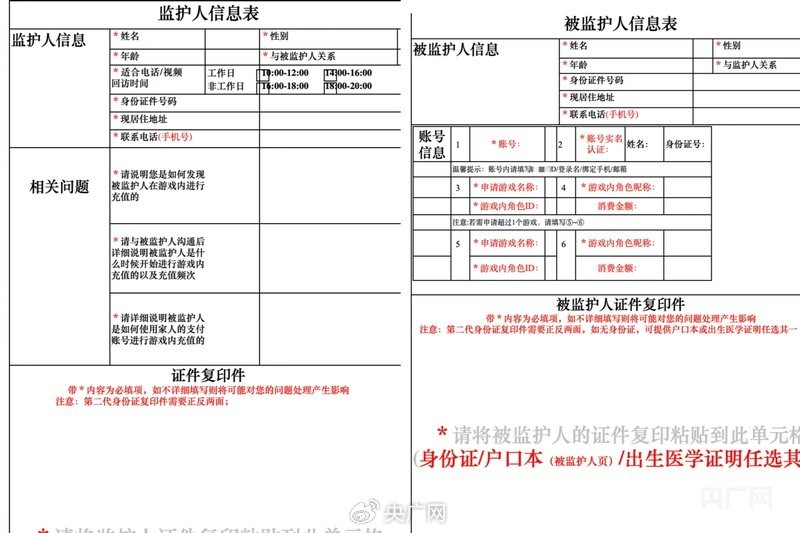 某平台未成年人申请退款需填写的部分信息。央广网 图