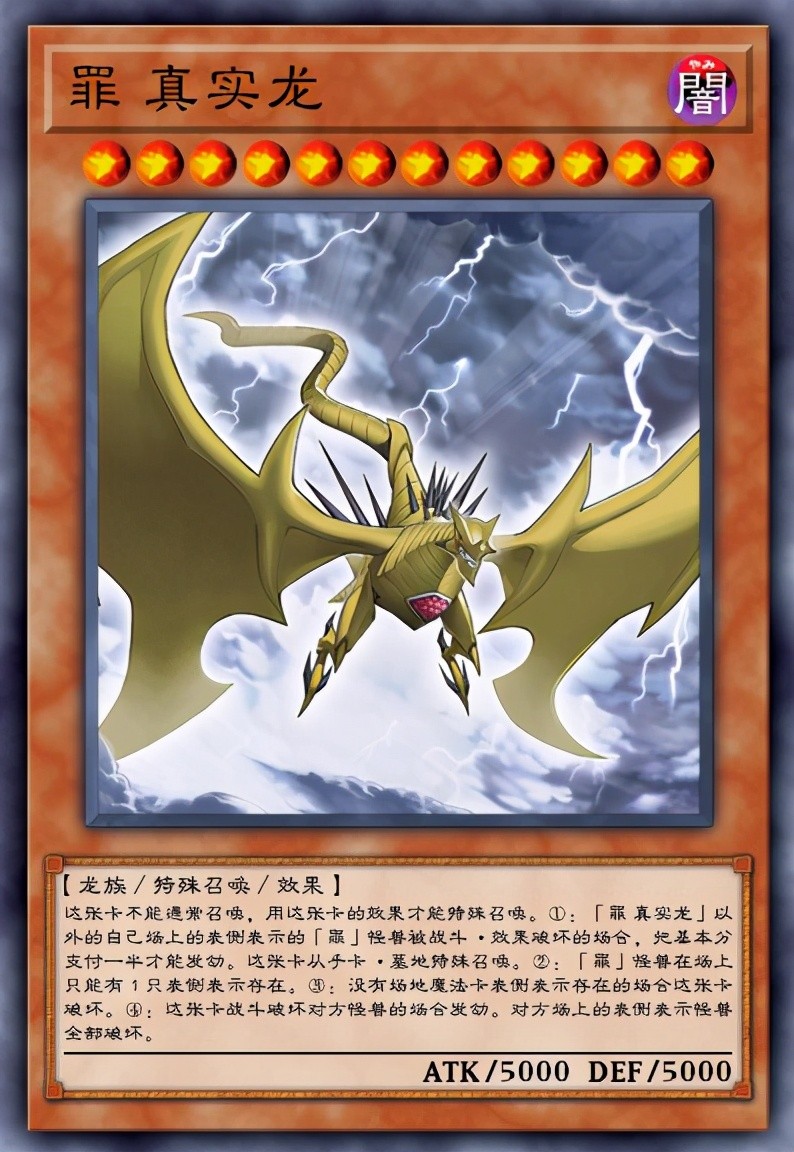 这张卡不能通常召唤,这张卡的效果才能特殊召唤。①:「罪 真实龙」以外的自己场上的表侧表示的「 罪 」怪兽被战斗·效果破坏的场合,把基本分支付一半才能发动。这张卡从手卡·墓地特殊召唤。②:「 罪 」怪兽在场上只能有1只表侧表示存在。③:没有场地魔法卡表侧表示存在的场合这张卡破坏。④:这张卡战斗破坏对方怪兽的场合发动。对方场上的表侧表示怪兽全部破坏。