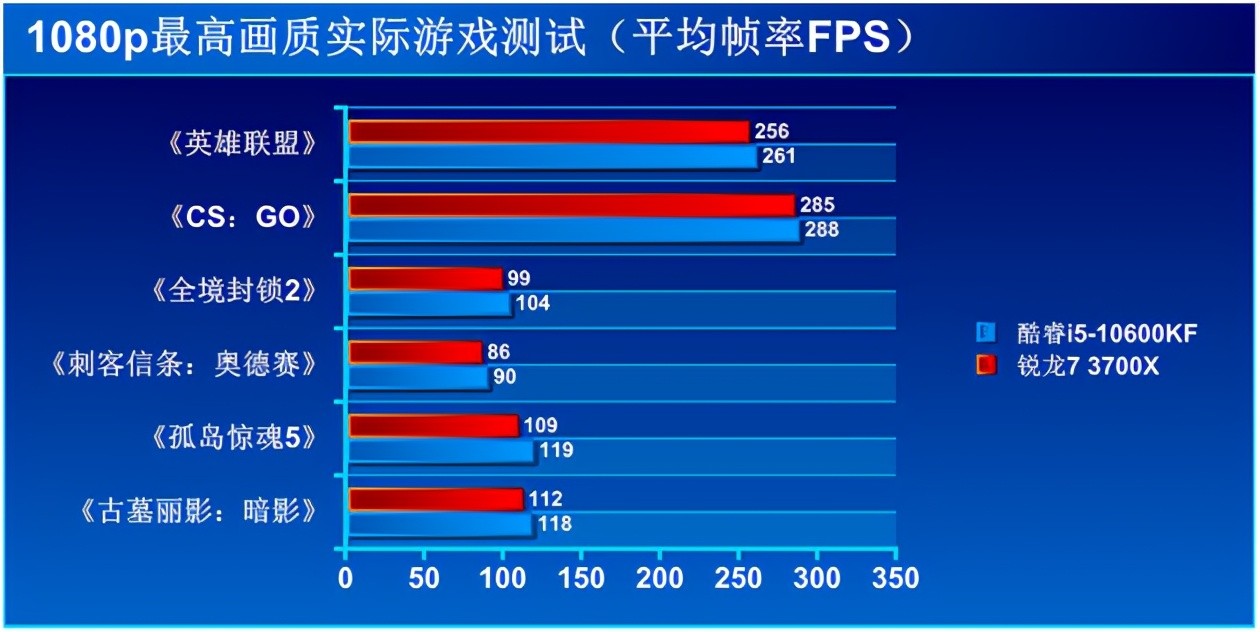 在真实游戏中的测试成绩让人惊讶:英特尔酷睿i5-10600KF和AMD锐龙7 3700X在大多数游戏中都表现得旗鼓相当,甚至在《孤岛惊魂5》、《剑网3》、《古墓丽影:暗影》等游戏中占据一定优势。