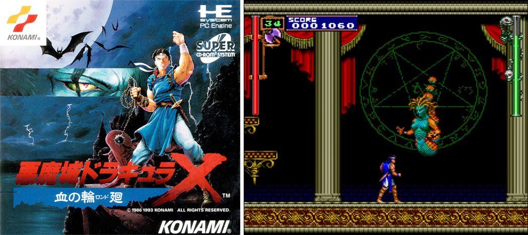 当时1993年在PC-Engine上推出的《恶魔城X:血之轮回》游戏封面与画面。