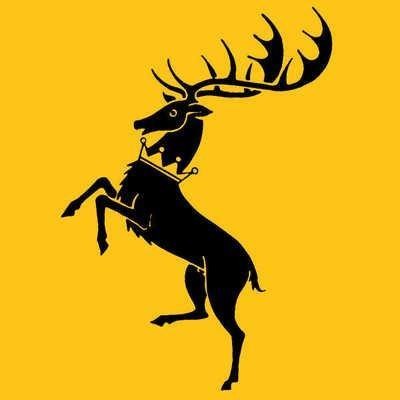 说起颜色,最明显的就是金色和黑色,金色没什么说的,王室嘛,和他们沾亲带故的也都愿意用金色。黑色,最显眼的就是该家族成员的黑色头发。黑色也代表了拜拉席恩高贵的战士外衣下,暗藏的内在黑暗或隐藏的秘密。劳勃对外是一个战士,私下里却是寻花问柳并虐待发妻。