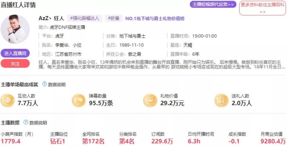 除了账号之外,各位网友可能不知道的就是,狂人在其公会也是有股份的,而且也有着自己的公司。狂人的公司在这里就不用说了,经常看直播的时候水友们都会喊上一句“爱华集团有钱”。那么对于狂人来说,是其直播平台的DNF一哥,再加上也是一位OW,身价肯定是不少了,而根据各类数据得知,狂人的身价足足有9200w之多!比英雄联盟职业选手UZI还要高出1000w,可见狂人多有钱了吧。