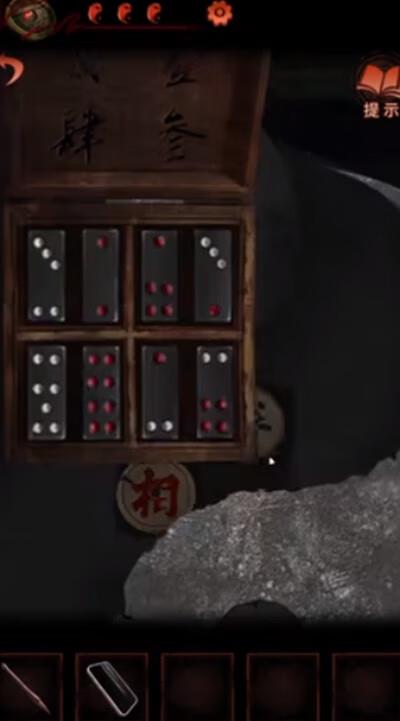3、去后院桌子按照正确方式排列牌九,获得象棋的卒和相,把卒镶嵌到石敢当的凹槽里,拿到黑白珠子;