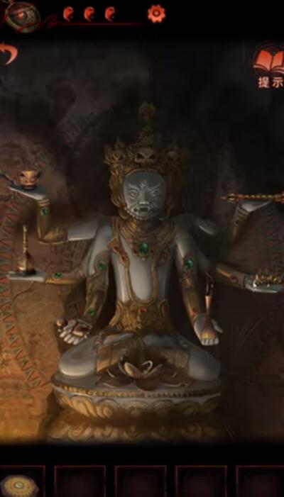 16、去佛堂根据提示放置雕像手上的物品。拿到环状饰品和小方块;回到最初的房间,把小方块放在左边柜子的左侧拼图上;