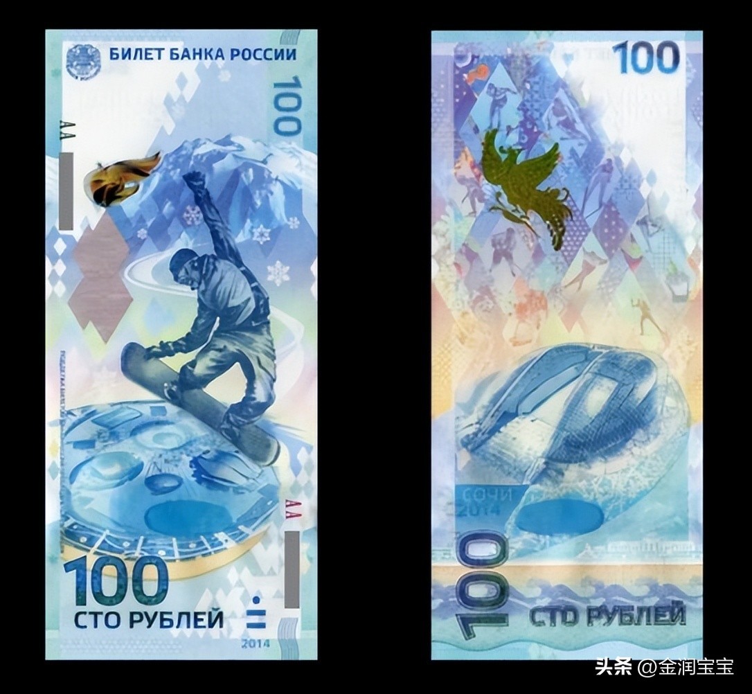 图案:正面是一位腾空的滑板滑雪者,背面是索契冬奥会体育场。