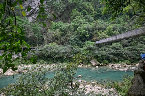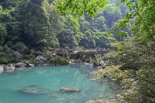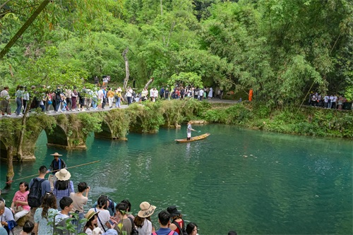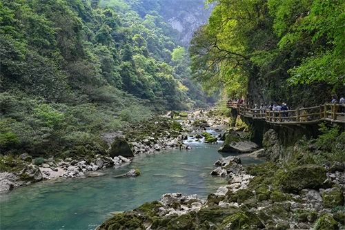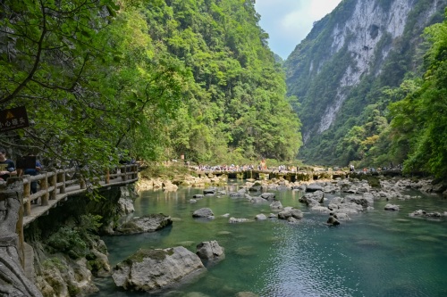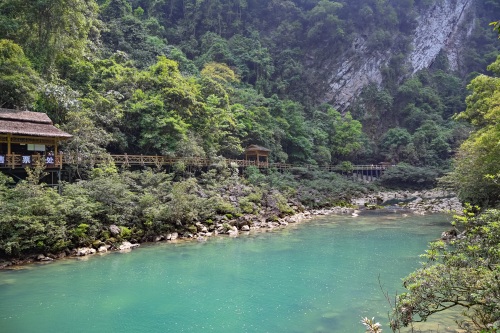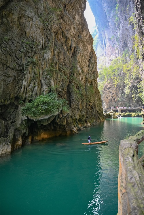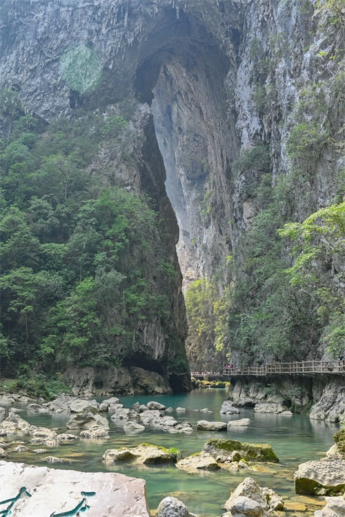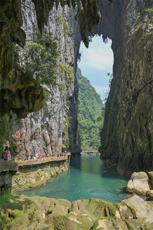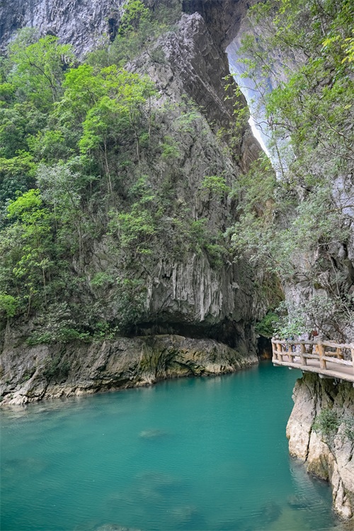 大七孔景区面积相对小七孔景区要小一些,全程用时约2小时左右。从游客中心进入后再坐船至景区码头,沿途两岸山崖耸立,河水碧绿幽深,景色十分怡人。从景区码头下船后沿着栈道进行游玩,景区最壮观的莫过于天生桥,一个天然的巨石从中形成了一个孔洞,狭长幽深的河流穿孔而过,故称之为“天生桥”。游完其他景点后再到景区码头,然后乘船至游客中心,至此就完成了两个景区的游玩。