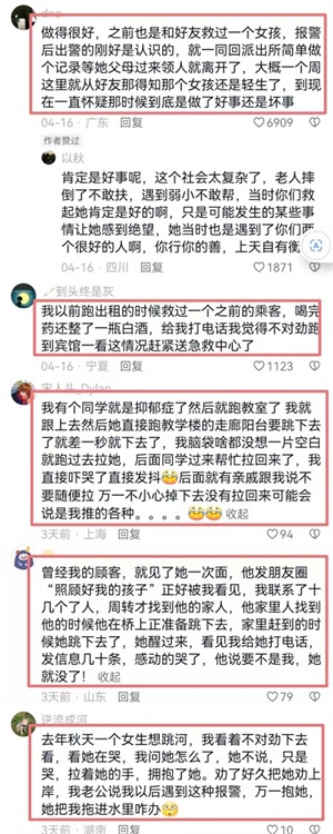 救人作者的妈妈还跟帖说是他儿子和几个女性朋友一起救的人,当时惊心动魄,她还希望被救女孩以后能好好活着。