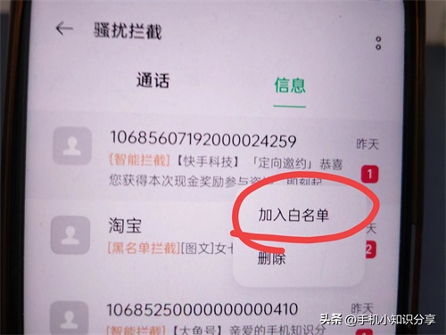 在此查看所需的验证码是否被拦截。若是,直接打开就能看到。若要解除拦截,长按两秒,选择将其移出黑名单即可。(如上图所示)