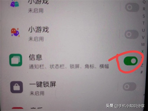 进入此页面后,往上滑动,找到信息或短信,一定要保证开关处于打开状态。如此,我们收到的验证码才能在通知栏、状态栏、锁屏、角标、横幅显示,才可以进行自动填充(如上图所示)