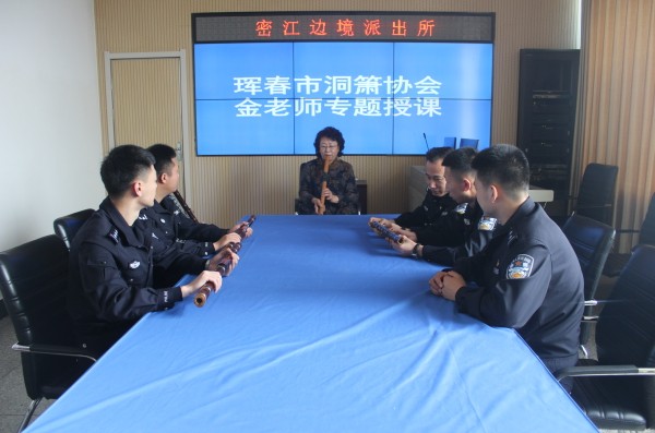 第二步:苦练洞箫技艺,演绎多彩警营。一个简单的道理:想要“拯救”洞箫文化,就得有人会吹洞箫,乡里没人会吹了,我们找人来教。地处偏远乡村的警营生活枯燥乏味,能够学习一种乐器自然也是丰富了警营文化生活。密江边境派出所邀请了珲春市洞箫协会人员为民警教授朝鲜族洞箫音乐,民警普遍没有声乐基础,学起来很吃力,正如密江边境派出所教导员讲的那样,“能吹出声音来,我们就在洞箫传承的路上前进了一步”。民警们苦练洞箫基本功,虽然目前还不能吹奏完整的曲目,但警营里的洞箫声声还是令过往的群众驻足倾听。