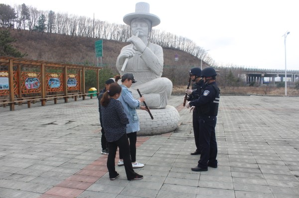 第三步:拓宽宣传渠道,营造浓厚氛围。密江边境派出所民警们利用走访之机,经常鼓励带动驻地各族群众学习吹奏洞箫,向群众宣传洞箫文化,教学吹箫方法。有时他们把群众请到警营里探讨一番;有时他们到田间地头跟劳作的村民闲聊一阵。警营里、农院中、溪水旁,不时传来一阵阵或低沉或舒缓的萧声。近年来,随着经济的发展,来密江河沿线旅游的游客逐渐增多,不少游客就是慕“中国朝鲜族洞箫艺术之乡”之名而来。密江边境派出所结合治安巡逻的有利契机,通过LED宣传屏、条幅、展板、宣传单等形式,向游客宣传、讲解密江洞箫文化,传播洞箫精神。通过我们的点滴努力,让游客将洞箫文化传播出去,让更多的人了解洞箫文化、喜爱洞箫文化。