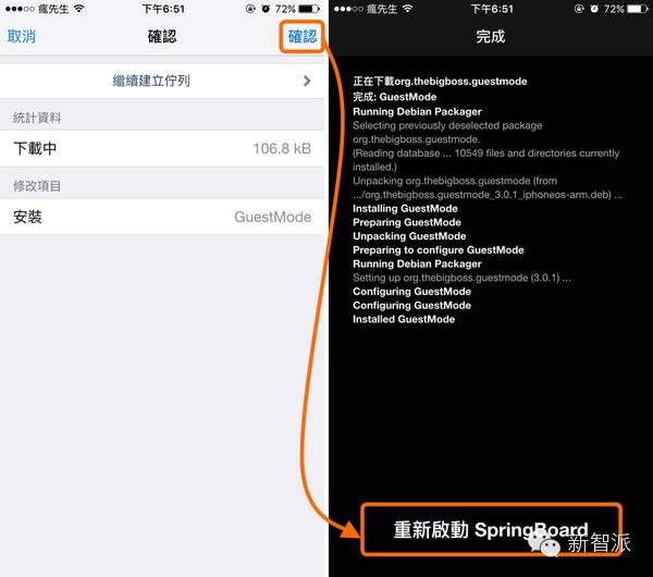 Step 2. ▼ 点选「确认」安装,安装完毕再点下「重新启动SpringBoard」。