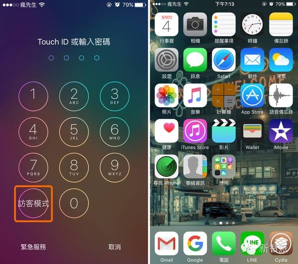开启功能后,在解锁画面上就会看见访客模式按钮,只要点一下就可进入访客模式,可别以为进入访客模式与一般模式都一样,功能就藏在细节裡,我们怎么点APP都没任何反应开不起来,可别认为是出问题,后面我们要设定想要启动的APP或功能才能让访客模式执行。