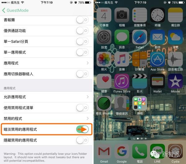 除此之外,还可针对应用程式是否要启动隐藏APP,也可开启「暗淡禁用的应用程式」显示模式。