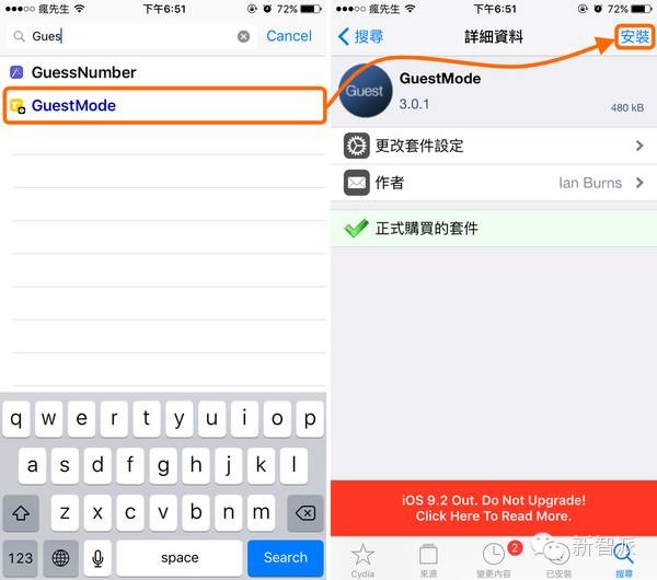 Step 1. ▼ Cydia 搜寻「Gues」,会找到「GuestMode」,再将它购买安装起来(售价0.99美元)
