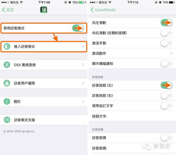 此功能类可用来设定所有进入访客模式功能,像是可透过手势、按钮、密码这叁种功能去开启相关功能,举例来说开启向左滑动,这是在输入解锁画面在往左滑动就会进入访客模式,或是可透过解锁画面新增一个访客按钮与自订按钮文字。