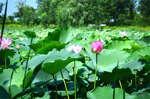 站在湖边,不由得会想起那句诗句来:接天莲叶无穷碧,映日荷花别样红。