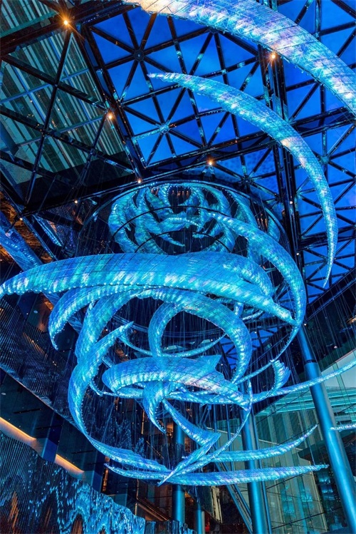 整体设计施工到安装,历经一年的时间:有着多达7000片水晶片和1000多根吊点,邀请了大学教授团队数十次计算以及验证,光是水晶片就有数千个不同角度和形态。