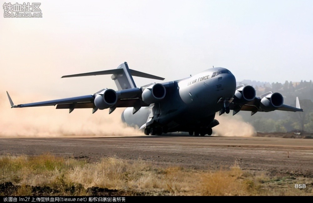 美国C-17战略战术运输机在砂地跑道降落
