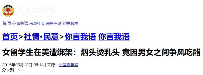 人民政协网-2015年6月12日-《女留学生在美遭绑架:烟头烫乳头 竟因男女之间争风吃醋》