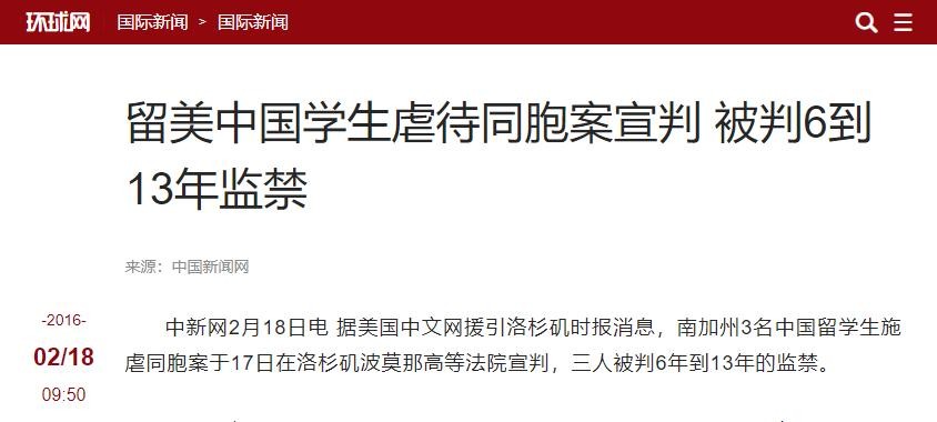 环球网-2016年2月18日-《留美中国学生虐待同胞案宣判 被判6到13年监禁》