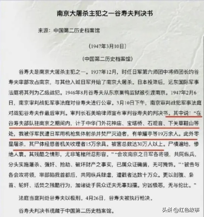 虽然她是老师,她应该忘记了1947年的南京审判战犯军事法庭的审判。判决书是这么说的:谷寿夫部队驻守南京期间,在中华门外花神庙、宝塔桥、石观音、下关草鞋山等处,用机枪集体射杀并焚尸19万余人。此外零星屠杀收埋者15万余人,被害总数远超30万余人。整个南京城,尸横遍野、惨绝人寰。