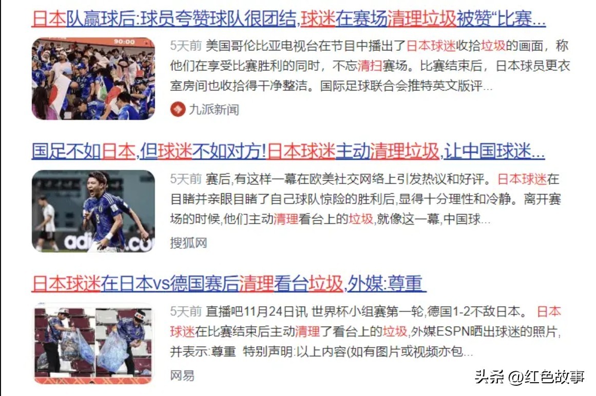 其次,日本在这次卡塔尔世界杯上捡垃圾,不是环保意识强,而是作秀。有媒体拍到,他们其实是有专门的团体配合,团体成员有的成员是专门负责制造垃圾,有的成员负责清理垃圾的。
