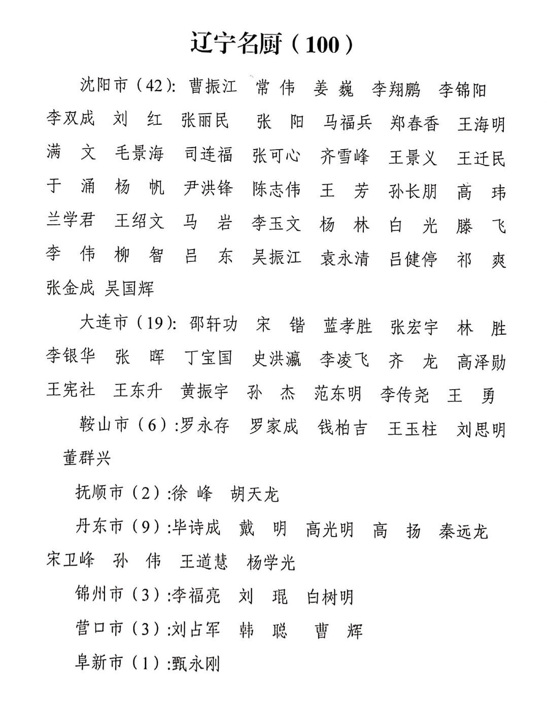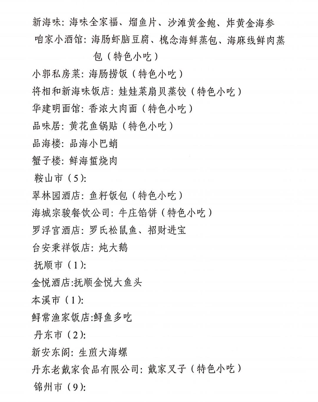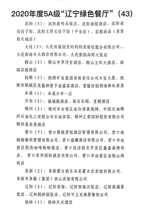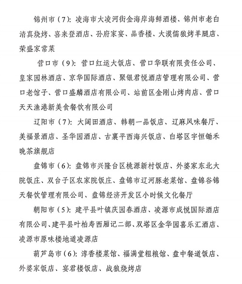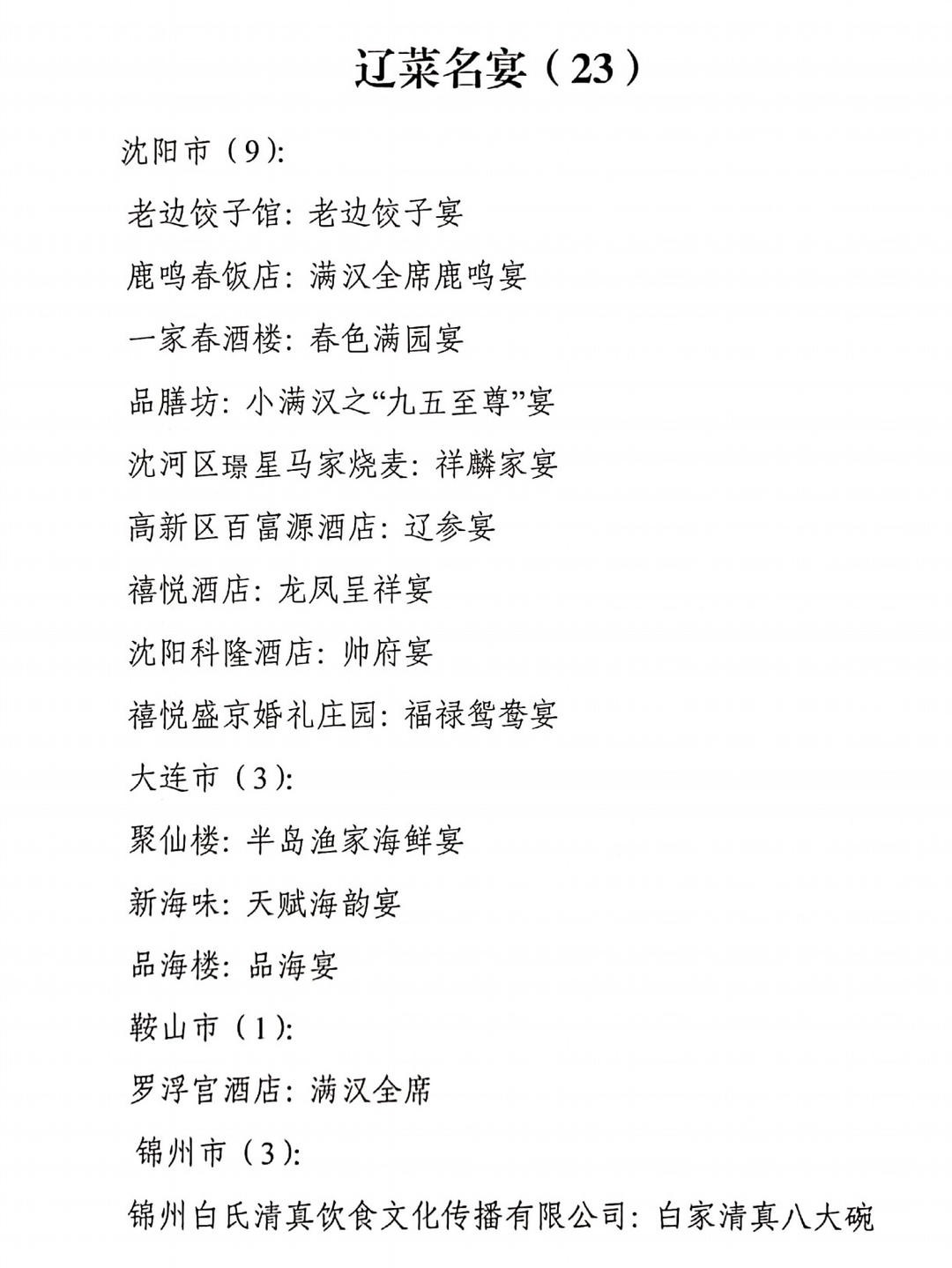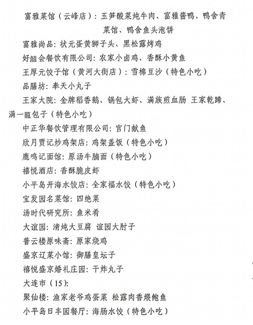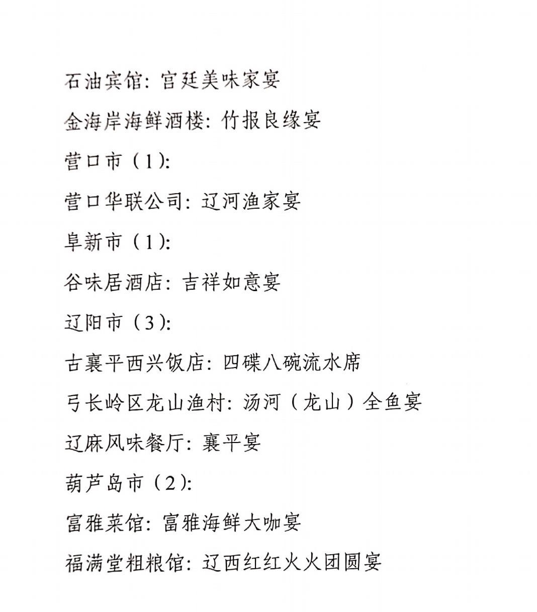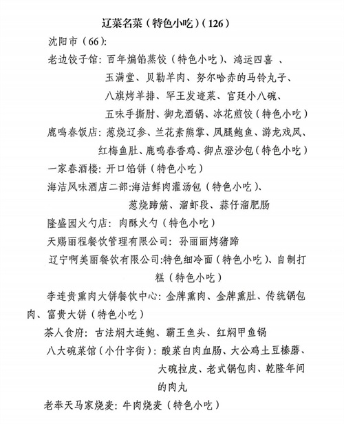 11月15日,辽洽会活动期间,在省商务厅、省市场监督管理局等单位主办的辽菜品牌推介大会上,88家“辽菜餐饮名店”、126道“辽菜名菜(特色小吃)”、23 席“辽菜名宴”、100名“辽宁名厨”、48家“辽菜特色食材基地”和43家2020年度5A级“辽宁绿色餐厅”名单正式予以公布。