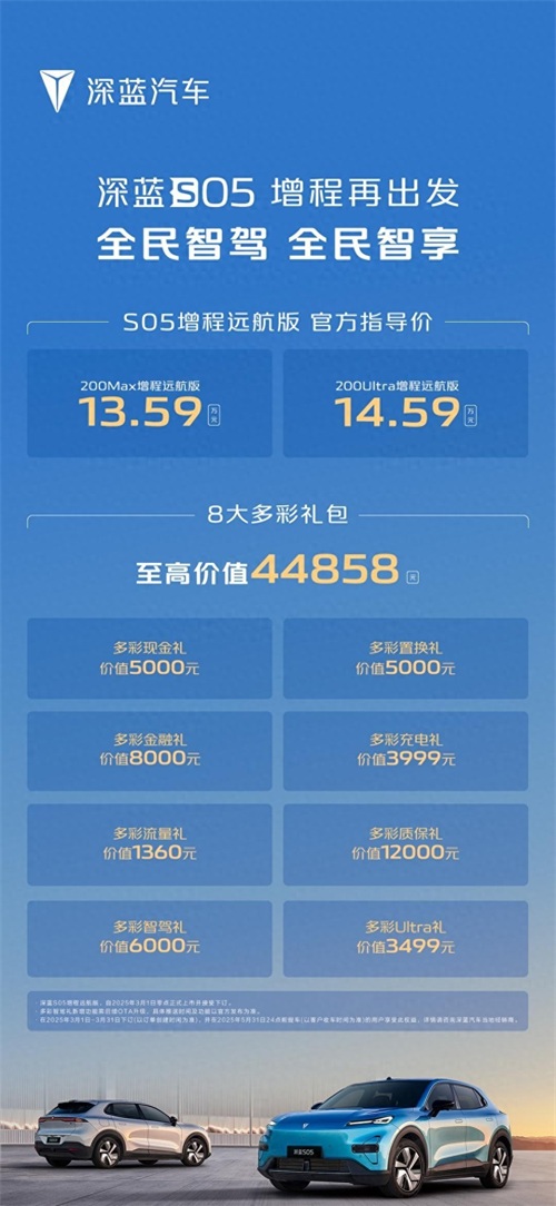 3月1日,深蓝汽车继开启全民智驾新时代之后,再度强势打响“全民智享”第一枪。其旗下备受瞩目的“多彩生活记录者”深蓝S05,增程再出发,焕新推出深蓝S05 200Max增程远航版和深蓝S05 200Ultra增程远航版,官方指导价分别为13.59万元和14.59万元。值得一提的是,新车还享受价值至高达44858元的“8大多彩礼包”,以满满诚意回馈广大用户的喜爱与信赖。