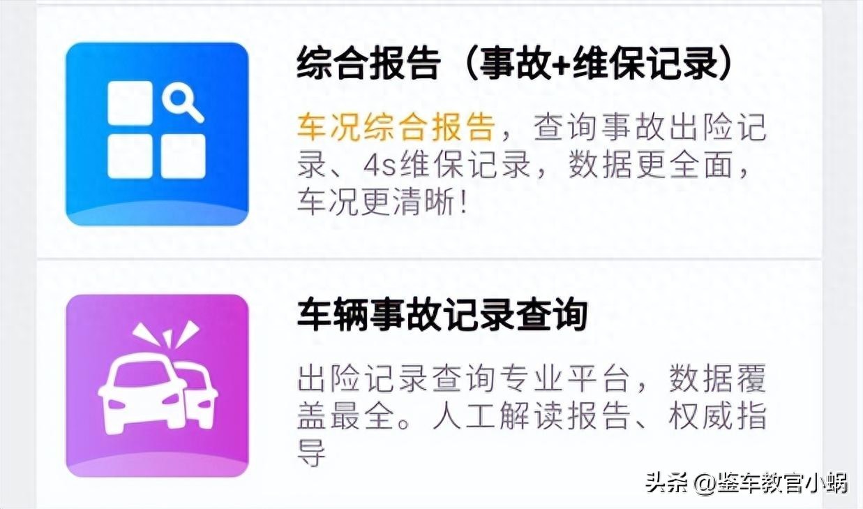 支付宝搜索【鉴车教官】小程序之后,选择综合查询(维保记录+车辆事故记录),或者车辆事故记录查询。