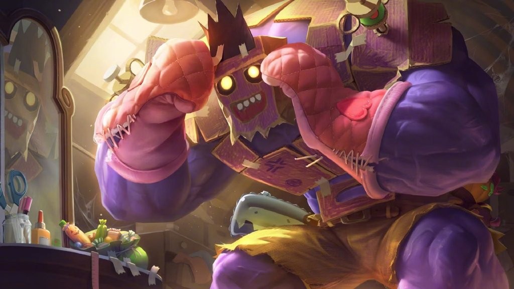 当年总觉得和原皮肤差别不大,现在看着还要多了,这面具看着更加的卡通和可爱了,换成了萌系画风的蒙多。