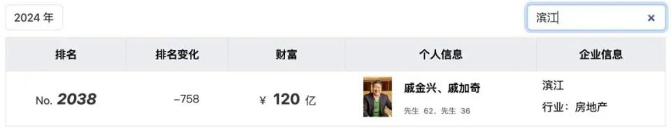 去年初至今,滨江的市值缩水超四成,仅剩 200 亿元。在 2024 年胡润富豪榜中,戚金兴的身家为 120 亿元,少了 55 亿元。